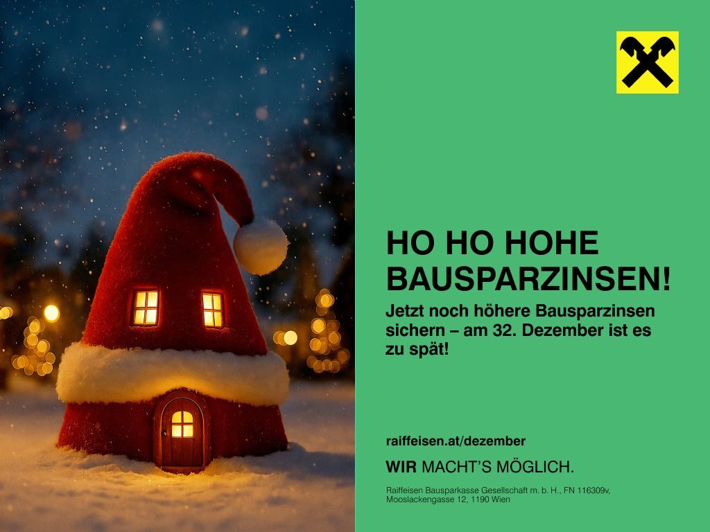 Der Dezember steht bei der Raiffeisen Bausparkasse traditionell im Zeichen einer guten Sache. Auch dieses Jahr unterstützen wir die gemeinnützige Stiftung Kindertraum mit einer Spende von 30.000 €. Zusätzlich gibt es ein kleines Weihnachtsgeschenk für dich: Wenn du dich bis zum Jahresende für einen klassischen Bausparvertrag oder einen Jugend-Bausparvertrag entscheidest, erhältst du im ersten Jahr höhere Bausparzinsen von 4 %* p.a. Das ist deine Chance, dir attraktive Zinsen zu sichern und zugleich Teil einer größeren Aktion zu sein.