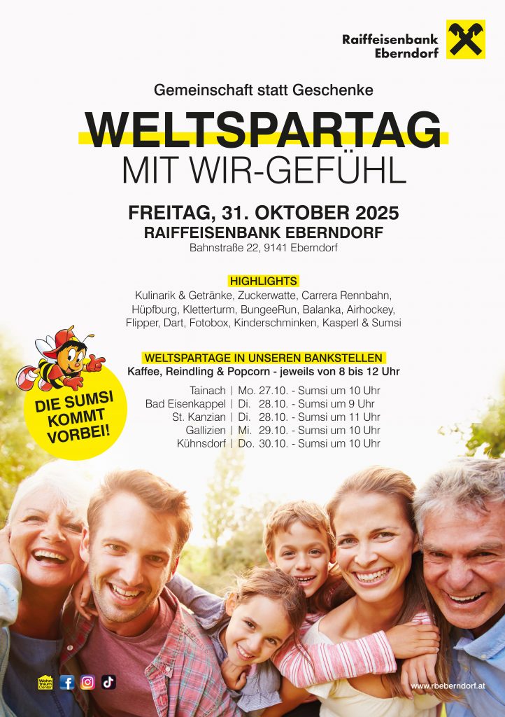 Das Highlight ist unser traditionelles Weltspartagsfest am Freitag, den 31. Oktober 2025, bei dem das gesamte Gelände der Raiffeisenbank Eberndorf in ein buntes Festareal verwandelt wird.